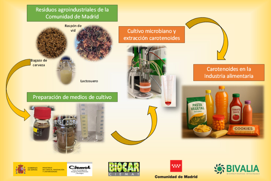 En el marco del proyecto BIVALIA, la Unidad de Biocarburantes Avanzados y Bioproductos del CIEMAT se centra en el uso de sustratos alternativos para la producción microbiana de carotenoides. En este sentido, se están investigando diferentes fuentes alternativas ricas en azúcares que puedan utilizarse como fuente de carbono para el crecimiento de especies microbianas productoras de carotenoides. En particular, se están evaluando diferentes residuos procedentes de diversos sectores de la industria agroalimentaria de la Comunidad de Madrid, incluyendo actividades como la cervecera, la producción de vino o la industria láctea. Además de la utilización de residuos locales, también se está estudiando la optimización de los procesos de producción con el objetivo de determinar las mejores condiciones que permitan maximizar los rendimientos de conversión de azúcar en carotenoides. Factores como el pH, la concentración de oxígeno disuelto y/o el uso de factores externos como el estrés celular por limitación de nutrientes o por una alta osmolaridad de los medios de cultivo, pueden desencadenar una producción óptima de carotenoides.