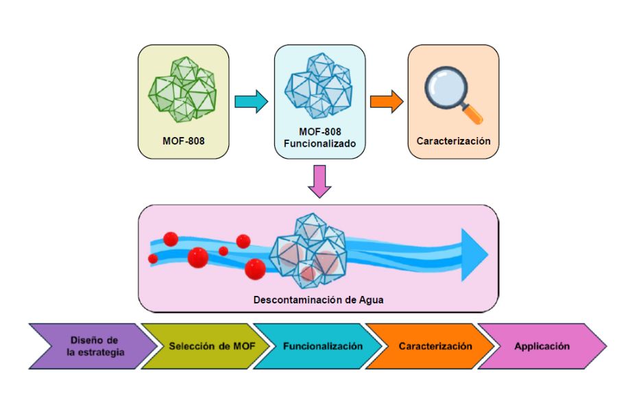 Ante este desafío, nuestro trabajo explora una nueva estrategia basada en materiales porosos avanzados, conocidos como redes metal-orgánicas (MOFs),5 para la captura selectiva de PFAS en agua. Los MOFs son materiales híbridos formados por nodos metálicos y ligandos orgánicos que se organizan en estructuras altamente porosas. Una de sus grandes ventajas es que su composición y estructura pueden ajustarse “a la carta” para una aplicación concreta. En particular, nos centramos en un MOF basado en circonio, denominado MOF-808,6 conocido por su elevada estabilidad en agua y su gran versatilidad química. Este material presenta posiciones de coordinación accesibles que pueden modificarse tras su síntesis mediante un proceso conocido como funcionalización post-sintética. Esta característica permite introducir nuevas funciones químicas sin alterar la estructura del material.