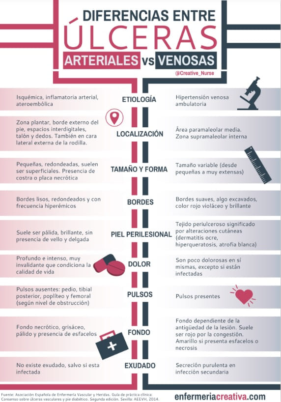 Para diferenciar las úlceras venosas de las arteriales, dejamos la siguiente infografía de Enfermería Creativa: