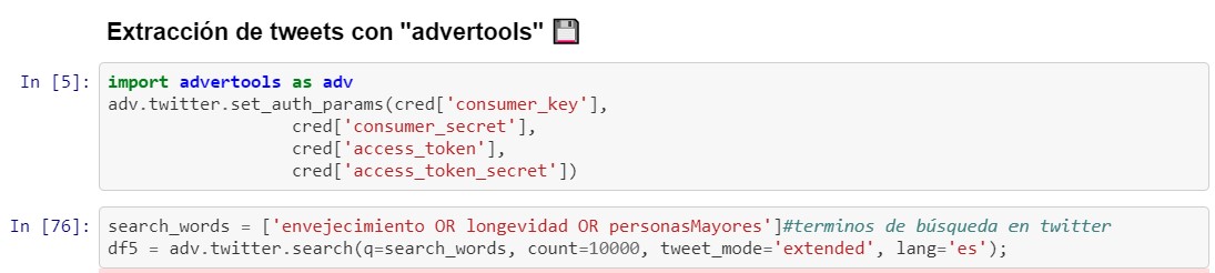 Para llevar a cabo este análisis, como se mencionaba, se ha elegido Twitter como la fuente de recursos de datos debido a que es ampliamente utilizado y simple en su mecánica de difusión de tal manera que su exploración es accesible y suficientemente amplia para tener una relevancia estadística. El análisis se ha focalizado sobre el contenido en español de la red social y sobre los usuarios que tuvieran interés en los ámbitos del “envejecimiento, longevidad y personas mayores”.