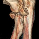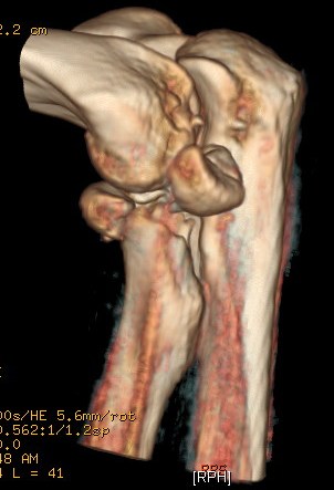 En los quince años que llevamos trabajando en este ámbito asistencial era la primera vez que veíamos un caso así. Esto tiene sus ventajas e inconvenientes. Entre las primeras que suspone una oportunidad de aprendizaje personal o compartido. Entre las segundas la incertidumbre ante la probable evolución y el resultado funcional para el paciente. Expondremos ahora cuáles han sido estos. Contamos, además, con una potente herramienta diagnóstica que facilita el trabajo del médico traumatólogo a la hora de la intervención. Se trata de la tomografía con la que se hace una reconstrucción tridimensional de la estructura estudiada. Podemos ver la fractura con un fragmento volteado hacia posterior: