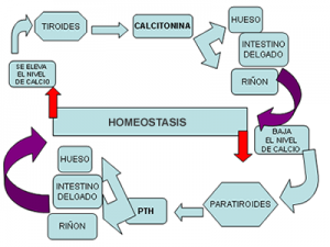 Los niveles sanguíneos de calcio se aumentan por la hormona paratiroidea o parathormona (PTH), producida por las glándulas paratiroides. Se disminuyen por la acción de la calcitonina, producida por la glándula tiroides.