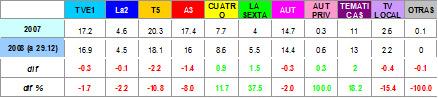Cabe resaltar que este 2008 se ha producido el liderazgo mensual con el resultado más bajo de la historia: Telecinco ganó el mes del noviembre de 2008 con el peor resultado para el líder de la historia (un 17,6% de cuota de pantalla). En el caso de La 1 destaca que firmó su mínimo histórico mensual en junio de 2008, con un 15,4%. De Antena 3 destaca la obtención, al igual que en el caso de Telecinco, de mínimos diarios históricos.