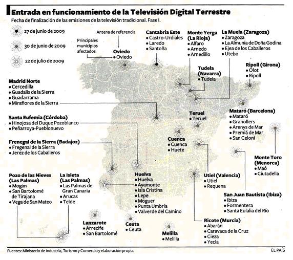 Quinientos municipios de trece Comunidades Autónomas y de las Ciudades Autónomas de Ceuta y Melilla han iniciado el cambio al nuevo sistema de emisión al cumplirse dos de las condiciones establecidas por el Gobierno: que la cobertura digital iguale o supere a la analógica y que se garantice la continuidad del servicio de televisión. Por razones técnicas, en algunas zonas la transición digital de esta primera fase se llevará a cabo hasta el 15 de julio. A partir del 22 de julio se iniciará la segunda etapa del proceso de transición a