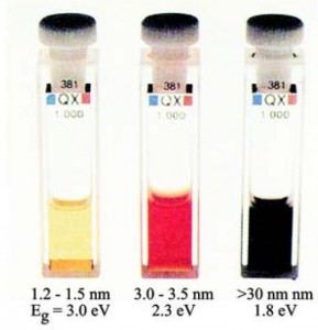 El CdSe, al que antes nos hemos referido, posee un Eg ≈ 1,8 eV. Con este valor del gap energético casi todas las longitudes de onda visibles serán absorbidas y el color del material será oscuro. En cambio las nanopartículas de CdSe de 3 nm muestran un color amarillo-naranja porque al ser Eg ≈ 2,3 eV (que corresponde a la longitud de onda del azul claro) se absorbe el azul claro y las partículas exhiben el color complementario que es amarillo-naranja. Si el tamaño de las nanopartículas disminuye —por ejemplo a 1.2 nm— el gap Eg aumenta —en este caso a 3 eV— y el color también varía; ahora se absorbe preferentemente el color azul violáceo y las partículas exhiben un color amarillo limón. Para nanopartículas grandes se recupera el valor de Eg que corresponde al cristal, 1,8 eV, y la solución tiene un color oscuro como se indica en la siguiente figura.