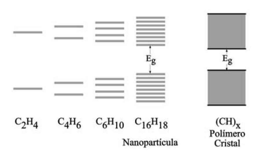 Con el seleniuro de cadmio CdSe, por ejemplo, se pueden formar nanopartículas que se comportan como puntos cuánticos si su tamaño es menor de 4 nm. Para nanopartículas grandes (30 nm, por ejemplo) el gap energético (la diferencia de energías entre las bandas de “valencia” y de “conducción”, Eg ) es de 1,8 eV, muy parecido al de un cristal macroscópico. Sin embargo, cuando el tamaño es de 1,2 nm, Eg vale 3,0 eV.
