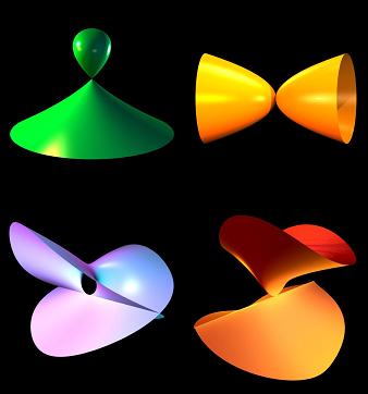 Dos características se observan inmediatamente. Las figuras son bastante sencillas y naturales (porque las ecuaciones son las más sencillas). Esparcen una belleza reconcentrada. Y en algunos puntos la superficie no es tan agradable al tacto: pincha. Al tocarla podríamos cortarnos, o no es cómoda para sentarse encima. Estos puntos, que se llaman las singularidades de la superficie, son los lugares donde la superficie no es lisa como el pompis de un bebé o una duna de arena en la playa. Son los puntos más interesantes, porque corresponden, en el problema matemático que hay detrás, a las rupturas, a los saltos y, en el extremo, a las catástrofes. Lo que vemos sólo es la visualización de un fenómeno más profundo algebraico y analítico, la no diferenciabilidad de una función en un punto.