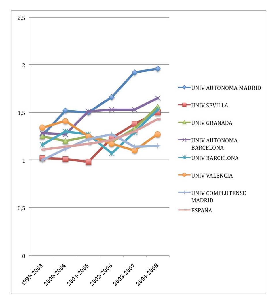 se observa un crecimiento constante, y un decrecimiento en el último quinquenio, que puede ser debido a la emergencia en el ámbito internacional de las potencias asiáticas, especialmente China y Corea del Sur. No debe preocuparnos ese descenso, pues el número total de artículos en el quinquenio 2005-2009 va a ser de nuevo mayor que en el anterior.