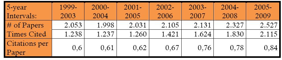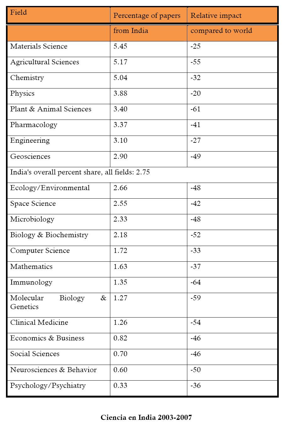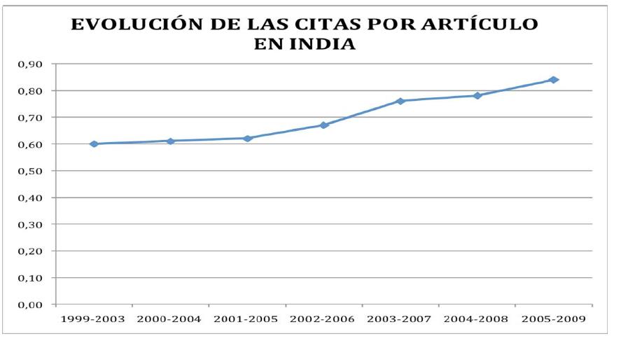 nos indica la evolución del número de artículos, del número total de citas y del factor de impacto medio, con artículos que tienen al menos un firmante en algún centro de investigación en India. La tabla da estas cifras por quinquenios desde el correspondiente al periodo 1999-2003 al 2005-2009 (este último es una proyección a la vista de los datos actuales).