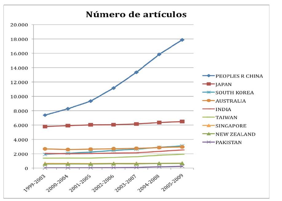 Por otra parte, para analizar adecuadamente la evolución reciente, conviene compararse con los países del entorno. Así, en las siguientes tablas, mostramos la evolución del número de artículos, del número total de citas y del factor de impacto de India, China, Corea del Sur, Japón, Singapur, Taiwan, Pakistán, Australia y Nueva Zelanda, y extraeremos algunas conclusiones.