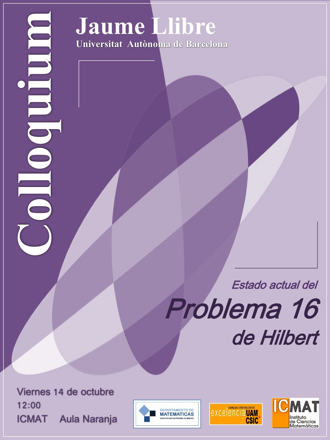 El próximo Viernes, 14 de Octubre, a las 12:00 el Profesor Jaume Llibre, catedrático de matemática aplicada de la Universidad Autónoma de Barcelona, impartirá el coloquio de matemáticas UAM-ICMAT con el título “Estado actual del problema 16 de Hilbert”.