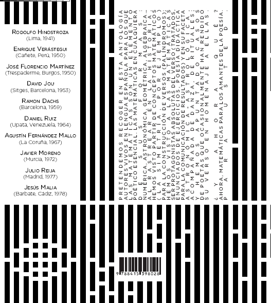Pretendemos recoger en esta antología autores vivos en lengua española para los que las matemáticas son un elemento poético esencial. Las matemáticas en cualquiera de sus formas: numérica, astronómica, geométrica, algebraica… al rastrear en la historia, hemos visto partir de conceptos matemáticos (la simetría, por ejemplo) para la construcción de versos (palíndromos); hemos visto a las matemáticas ser protagonistas absolutas del verso (tratados, enunciados de ejercicios, poesía didáctica para la comunicación de resultados) y en su faceta astronómica-astrológica, acompañada de danza, de rituales; y hemos apuntado casos de poetas que ocasionalmente han rendido su verso en homenaje a ellas. ¿Y ahora qué? Ahora, matemáticas para los amantes de la poesía. Para usted.