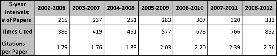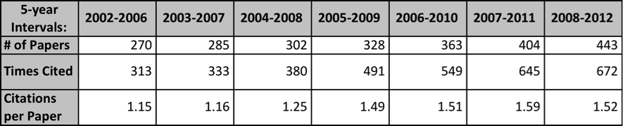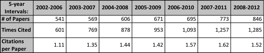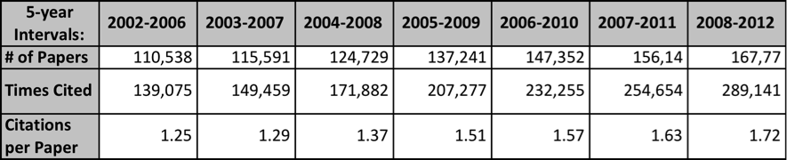 Si examinamos la producción e impacto de los matemáticos brasileños, por quinquenios, desde 2002, vemos que el incremento en artículos en el JCR del último quinquenio (2008-2012) al primero (2002-2006) ha sido de un 80%, mientras que el número de citas lo ha hecho en un 140%.