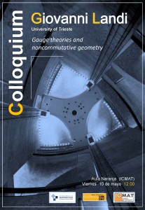 Giovanni Landi, actualmente profesor de matemáticas de la Universidad de Triestre, impartirá la conferencia «Gauge theories and non conmmutative geometry», dentro del programa de coloquios conjuntos del Instituto de Ciencias Matemáticas (ICMAT) y del Departamento de Matemáticas de la Universidad Autónoma de Madrid (UAM). Será el próximo 10 de mayo a las 12:00.