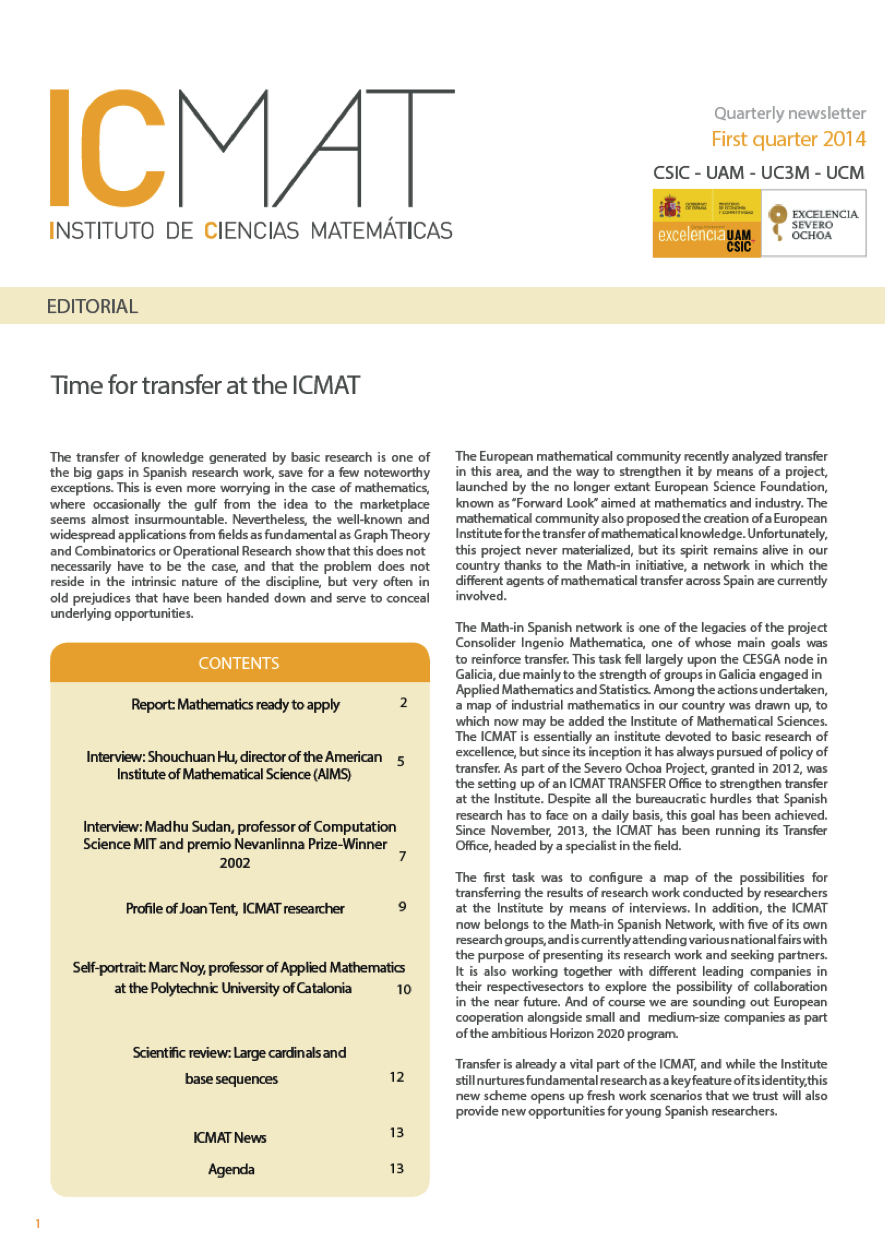 El ICMAT dedica su editorial a la transferencia de la investigación matemática básica, poniendo de relieve su vocación de transferencia desde sus inicios, así como la reciente puesta en marcha de la Oficina ICMAT TRANSFER, que cuenta entre sus objetivos con la valoración de posibilidades de transferencia dentro del Instituto y la búsqueda de colaboraciones con empresas tanto nacionales como europeas.