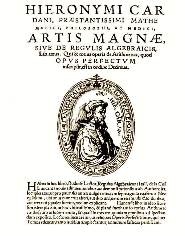 Partiendo de las técnicas de Tartaglia, Cardano había de encontrado una fórmula general de la ecuación de tercer grado. Simultáneamente, Ferrari había conseguido resolver uno de los tipos de la ecuación de cuarto grado. Todo este material aparecía el Ars magna. Además, demuestra por primera vez que las soluciones pueden ser negativas, irracionales, e incluso pueden implicar raíces cuadradas de números negativos.