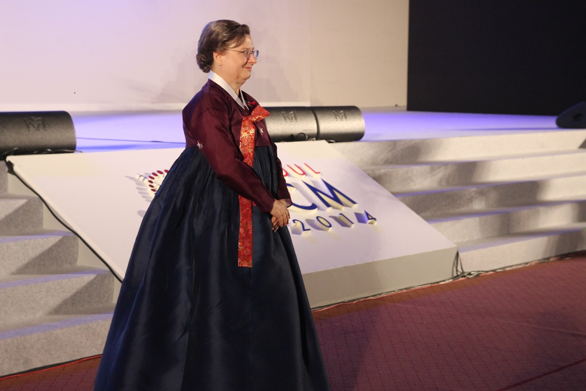 Después, los principales responsables del Congreso, Ingrid Daubechies como presidenta de la Unión Matemática Internacional (IMU) y Hyungju Park, director del Comité Organizador, ambos ataviados con trajes tradicionales de Corea, propusieron un brindis por los nuevos premiados, y por todos los matemáticos del congreso. Para concluir habló Philip Griffiths, investigador del Instituto de Estudios Avanzados y recién premiado con la medalla Chern.