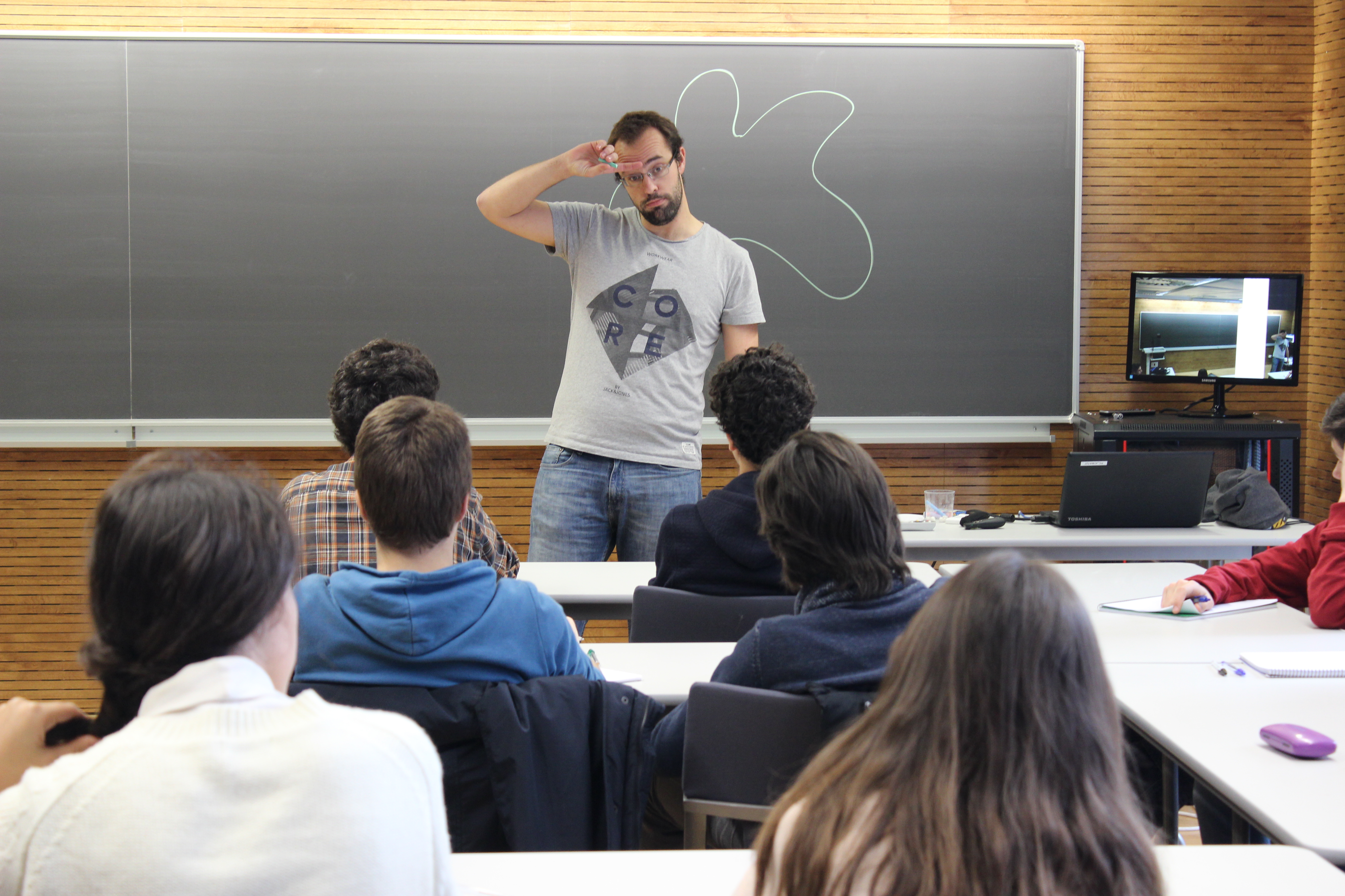 El pasado miércoles, 25 de marzo, los 30 estudiantes que han participado en esta edición del programa 4º ESO+ Empresa en el ICMAT, se tuvieron que enfrentar al problema de cálculo de áreas. Además, sin suponer ningún conocimiento previo. El primer paso fue la deducción del área del triángulo y, a partir de eso fueron acercándose a la solución, guiados por José Manuel Conde Alonso, investigador predoctoral (UAM-ICMAT)encargado de dirigir el taller. Primero dieron con la respuesta para figuras con lados rectos y después siguieron los pasos de Arquímedes para calcular el área bajo un arco de parábola y aproximar el valor del número irracional más famoso: Pi.