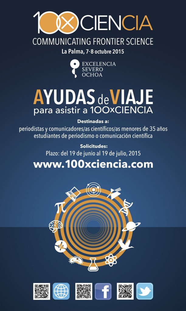 El foro 100xCiencia tendrá lugar los días 7 y 8 de octubre de 2015 en La Palma. El evento quiere incluir a todos los actores involucrados en la comunicación pública de la ciencia, y también a los más jóvenes. Muchos de ellos no cuentan con el apoyo de un medio de comunicación para realizar este tipo de desplazamientos, por lo que por lo que la organización del evento ofrece ayudas de viaje para estudiantes y periodistas interesados en acudir al encuentro.
