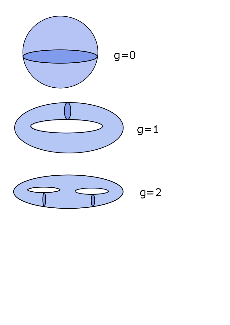 La superficie de la esfera tiene género 0, así como la de cualquier otra superficie que podamos obtener deformándola; las superficies con forma de neumático (lo que los matemáticos llaman un toro) tienen género 1.