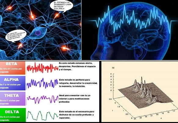 Las señales externas (acústicas, visuales) son convertidas en señales eléctricas que se transmiten a través de las neuronas. Algunas de ellas, son ondas solitónicas. La foto debajo, derecha representa una señal de neuroactividad con superposición caótica de solitones.