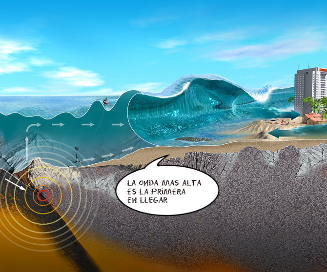 Los tsunamis surgen de un efecto de propagación de ondas solitónicas. El mecanismo es el siguiente: