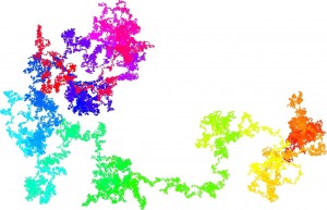 Este gráfico muestra un paseo aleatorio con un millón de dígitos en base 4 generados por ordenador, de manera que en cada paso el gráfico se mueve una unidad al este, norte, oeste o sur, dependiendo de la posición del dígito, indicando el color el camnino seguido en el paseo aleatorio.