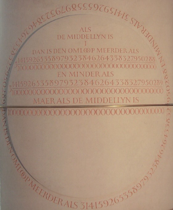 En el siglo XVI, Ludolph Van Ceulen pasó toda su vida calculando los treinta y cinco primeros dígitos de pi. Para ello utilizó las técnicas de Arquímedes y polígonos con una gran número de lados. En su tumba se leen la cota inferior y superior de pi. La tumba original desapareció, pero se conserva una réplica.