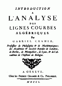 Gabriel Cramer fue un joven prodigio, nacido en una familia acomodada en Ginebra. A los 18 años defendió una tesis doctoral sobre la teoría del sonido, y a los 21 estaba opositando para una cátedra de filosofía. Aunque no era el candidato oficial (Amédée De la Rive), él y otros de sus contrincantes, el joven Giovanni Ludovico Calandrini, impresionaron tanto al tribunal por sus conocimientos, que decidieron dividir la cátedra en dos, una de filosofía y otra de matemáticas. Calandrini y Cramer deberían compartir la de matemáticas, lo que así hicieron a satisfacción de todos.