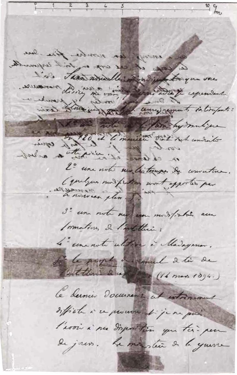 Vayamos al comienzo del caso Dreyfus. En septiembre de 1894, una mujer de la limpieza de la Embajada de Alemania en París encuentra una carta rota en seis pedazos sin fecha ni firma. La carta está dirigida al coronel alemán Maximilien von Schwarzkoppen, y anuncia el envío de notas confidenciales sobre el armamento y la organización del ejército francés.