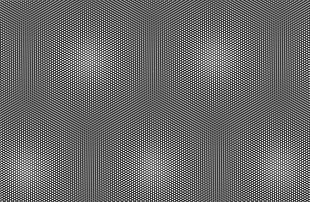 Pero, ¿cómo ocurre este fenómeno? Pensemos que una hoja de grafeno tiene una estructura cristalina como en la figura, es lo que se llamaría un retículo (sí, los matemáticos también le llamamos un retículo). Al superponer dos de estas hojas y girarlas una sobre otra en un ángulo apropiado (el ángulo mágico, 1,1 grados), las dos estructuras se combinan formando un superretículo la figura de Moiré que vemos en el gráfico de abajo), que permite la circulación de los electrones (y eso es la corriente eléctrica, una circulación de electrones en el material).