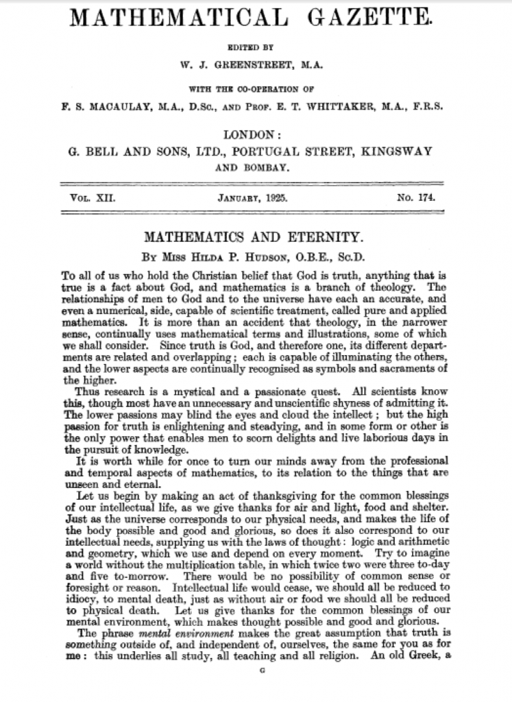 Una de las facetas curiosas de Hilda Hudson eran sus pensamientos sobre la relación entre las matemáticas y Dios. Su artículo titulado “Mathematics and Eternity”, publicado en la revista “The Mathematical Gazette”, en enero de 1925, comienza así: