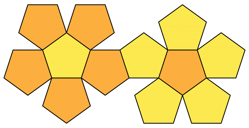 La idea fue considerar los desplegables o desarrollos de los sólidos platónicos. Como vemos en estas figuras,