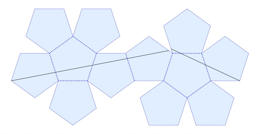 Lo primero a dilucidar es lo que se entiende por una línea recta, y es esto: Una trayectoria en línea recta en la superficie de un poliedro es una línea recta dentro de una cara que se extiende únicamente sobre un borde de modo que cuando las caras adyacentes se aplanan la trayectoria forma una línea recta en el plano.