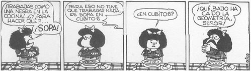 Y en esta, Mafalda se reafirma en su odio a la sopa y la degeneración de la geometría: