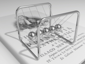 Uno de los dipositivos que a veces vemos en las mesas de los despachos consiste en una colección de péndulos (habitualmente cinco esferas) suspendidos de dos barras. Cuando movemos uno de los péndulos en los dos extremos y lo lanzamos contra el resto, el empuje se transmite a través de las tres esferas fijas de manera que la quinta se balancea hacia delante. Lo que poca gente conoce es que este dispositivo se llama la cuna de Newton (Newton cradle, en inglés).