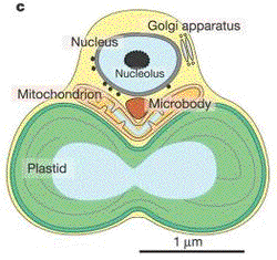 En esquema, una C. merolae en divisióncontiene un núcleo, una mitocondria en forma de “V”, un plástido conforma de mancuerna, un microcuerpo y un aparato de Golgi. Fuente: M. Matsuzaki et al. 2004. Genome sequence of the ultrasmall unicellular red alga Cyanidioschyzon merolae 10D. Nature 428: 653-657.