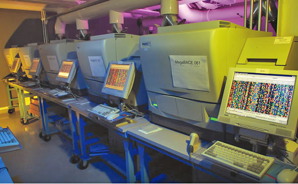 Una batería de secuenciadores del tipo usado en el Proyecto Genoma. Basados en el método de secuenciación de Sanger separan los fragmentos de ADN por electroforesis.