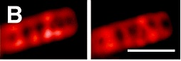 Dos imágenes de la misma célula de B. subtilis en la que se han teñido las espirales de ípidos de la membrana. Cada imagen se ha tomado a una profundidad diferente. Foto: Mol. Microbiol. 68: 1315–1327.
