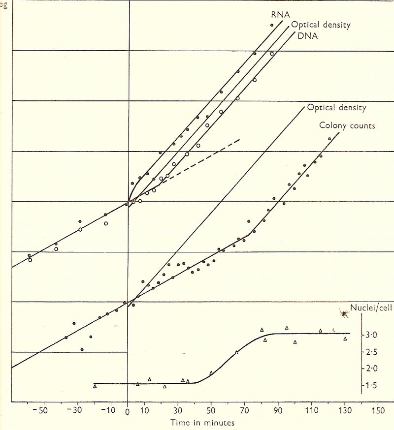 A tiempo 0 se “aceleró” un cultivo de Salmonella pasándolo de medio mínimo con glucosa a nutrient broth (un caldo con abundantes nutrientes). La gráfica representa los logaritmos de las medidas frente al tiempo. Nótese el cambio abrupto de una a otra velocidad de incremento en el ARN y la densidad óptica (una medida de la masa celular) del cultivo, seguidos poco después por el ADN. Esto se refleja también en el número de nucleoides por célula (recuadro). Mientras tanto el número de células sigue a la anterior velocidad durante 70 minutos, lo que deja que las células aumenten su tamaño hasta el característico del nuevo medio.