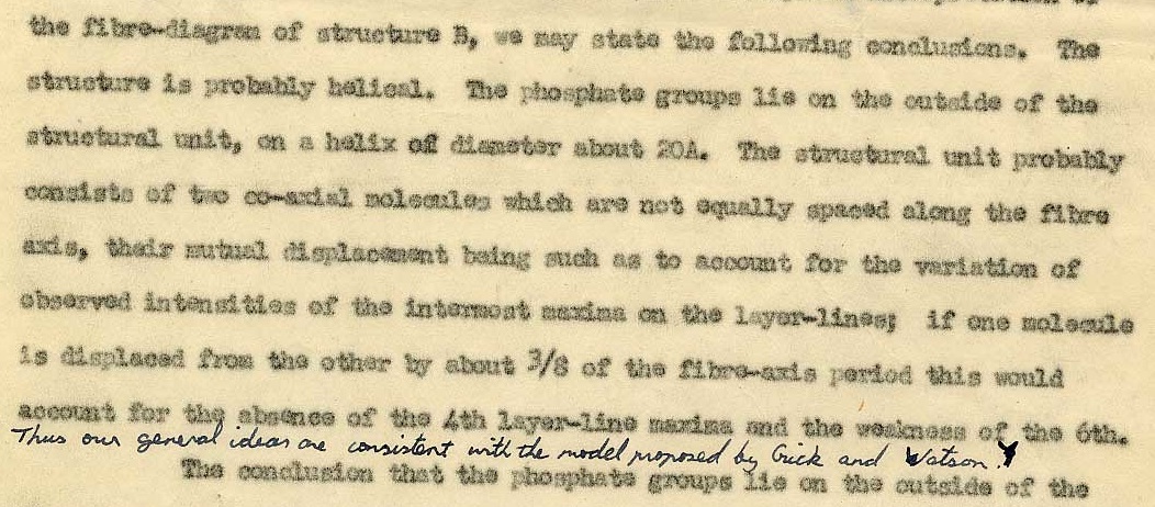 Adición al manuscrito de Nature. Rosalind solo tuvo que hacer pequeñas correcciones al manuscrito que ya tenía preparado para enviarlo a la revista Nature cuando  Watson y Crick enviaron su modelo. Quizás con un exceso de modestia escribió (penúltima línea de la figura): “Así, nuestra idea general es coherente con el modelo propuesto por Watson y Crick”. The Rosalind Franklin Papers. Se ve mejor abriendo la imagen en otra ventana.