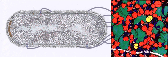 La aglomeración de un microcosmos. El intento de dibujar a escala todos los elementos que contiene una bacteria, Escherichia coli, da una impresión aproximada de los obstáculos que debe sortear para moverse una molécula que esté confinada en su interior. La imagen izquierda es una comunicación personal de Dennis Bray, la ampliación a la derecha tomada de Ellis and Hartl. 1996. FASEB J. 10: 20-26. En verde los ribosomas, encargados de la síntesis de proteínas (dibujadas en color rojo), son estructuras grandes y abundantes.