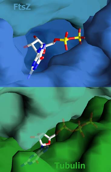 La actividad de FtsZ se localiza en el hueco que queda entre dos moléculas cuando se encajan una a continuación de la otra. Este hueco (el espacio entre los dos tonos de color azul) lo ocupa una molécula, el GTP (las barras de color azul, blanco, rojo y amarillo) , que proporciona a FtsZ la energía necesaria para realizar su función. Ese hueco es algo diferente en la Tubulina (en verde), el homólogo de FtsZ en nuestras células, y esas diferencias pueden utilizarse para obtener inhibidores específicos para una o la otra. Esta es la base de parte de las investigaciones que realiza el programa COMBACT. Mingorance et al. 2001. Mol. Microbiol. 41:83-91.