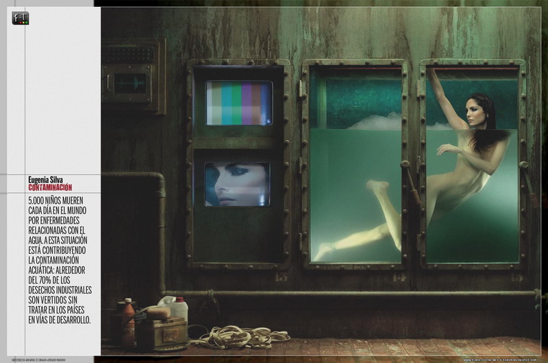 El agua, ambiente acosado. La destrucción de los hábitats acuáticos también puede modificar la biodiversidad y estar en el origen de nuevas enfermedades. Las enfermedades relacionadas con la mala calidad del agua, a la que van a parar el 70% de los desechos industriales de los países en desarrollo, provoca la muerte de 5000 niños cada día. Foto de la modelo Eugenia Silva en la revista Elle en español, julio de 2008.