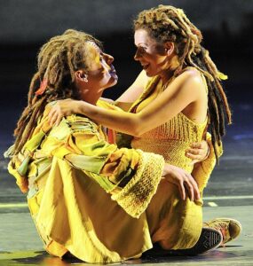 Irena Bespalovaite como Papagena y Christian Gerhaher como Papageno cantando «Pa-Pa-Gena!Pa-Pa-Geno!» en el «Salzburger Festspiele» 2006