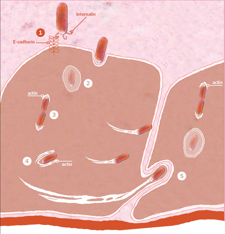 Una vez en el intestino Listeria produce internalina, una molécula de adhesión que interacciona con la cadherina E del hospedador. 1. La bacteria es tragada por la membrana del hospedador 2. Escapándose de la vesícula, Listeria se multiplica 3, cada nueva bacteria nueva queda envuelta en una nube de actina 4. Listeria se lanza por la célula formando una cometa de filamentos de actina y acaba perforando la membrana de una célula adyacente 5. en la que es engullida repitiendo los pasos del 3 al 5.