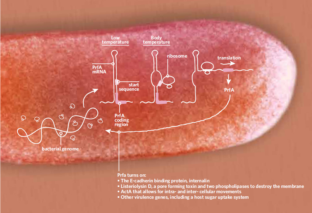 El gen prfA funciona como interruptor principal de los genes de virulencia de Listeria. A temperaturas bajas (izquierda), cuando la bacteria vive en materia vegetal en decomposición, la secuencia de iniciación del ARN mensajero de PrfA está plegada en forma de horquilla. Cuando la temperatura sube a 37°C, la temperatura del cuerpo (centro), la horquilla se abre y queda accesible la secuencia de iniciación a la que se une el ribosoma iniciando la traducción del mensajero del gen (derecha).