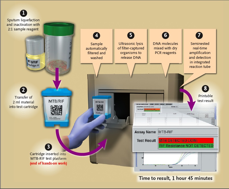 Un grupo de científicos de diferentes instituciones en Suiza, Alemania, Sudáfrica, Perú, India, Azerbaiyán, y Estados Unidos, acaba de publicar en The New England Journal of Medicine la comprobación de la eficacia de un nuevo método automático para detectar en no más de dos horas si una persona está infectada por el bacilo de Koch, Mycobacterium tuberculosis (MTB), causante de la tuberculosis. El método permite además detectar si la cepa que infecta al paciente es resistente a rifampicina (RIF), uno de los antibióticos de primera línea usados contra la tuberculosis.