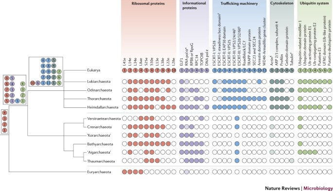 En la anterior entrada del blog Mingo y Miguel nos explicaron la conservación filogenética del agrupamiento dcw, donde se encuentran los genes encargados de que se sintetice la pared bacteriana y del divisoma. Entre esos genes hay unos cuantos que codifican para proteínas con función estructural como FtsZ y FtsA, que son homólogos de las proteínas eucariotas tubulina y actina respectivamente. También hay homólogos en las arqueas y eso indica que el ancestro de todas esas proteínas surgió antes de la separación entre los diferentes dominios. Pero también hay otras proteínas que solo se encuentran en uno de los dominios y no en los otros. Cuando uno se pone a comparar las secuencias de las proteínas presentes en bacterias, arqueas y eucariotas lo que aparece es un árbol filogenético en el que las arqueas siempre están cerca de los eucariotas. De hecho, algunas arqueas tienen cientos de genes que codifican para proteínas que se postuló que eran exclusivas de los eucariotas y que son conocidas como ESPs (por eukaryotic signature proteins).