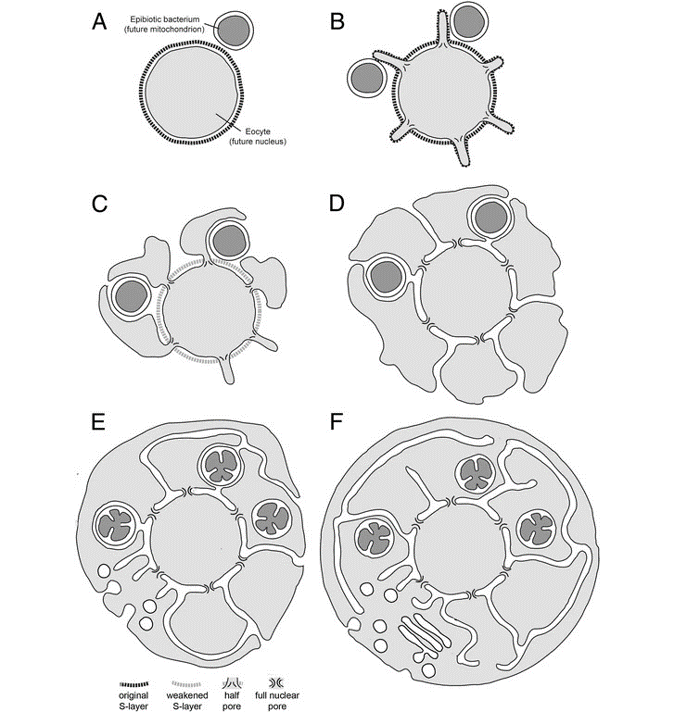 Cuando se descubrieron las arqueas asgardianas se encontró que sus genomas tenían un gran porcentaje de genes ESPs, entre ellos los que codifican para el sistema ESCRT, implicado en la arquitectura de las membranas intracelulares. También se hallaron varios homólogos de actina y de proteínas que se unen a actina muy conservados, lo que podía indicar que esas arqueas poseen un citoesqueleto. Lo malo es que no parecían fáciles de estudiar. En el 2020 se consiguió aislar y crecer a la primera arquea asgardiana. Prometheoarchaeum syntrophicum es un microbio de crecimiento muy lento (hasta 60 días para duplicarse), muy pequeño, y con una morfología celular muy curiosa. Son unos pequeños cocoides que presentan unas delgadas protrusiones en su membrana. Se postuló que esas protrusiones podrían estar presentes en la arquea ancestral que permitió la endosimbiosis mediante un modelo “de dentro hacia fuera”. Es decir, la arquea ancestral proyectó extrusiones que envolvieron a la bacteria simbionte y esas extrusiones se hicieron poco a poco más complicadas formando la envoltura nuclear y el retículo endoplasmático. El otro modelo, mucho más conocido, es el “de fuera hacia dentro”, en el que se postula que la bacteria fue engullida por la arquea y tanto el núcleo como el retículo endoplasmático son el resultado de posteriores invaginaciones de la membrana.